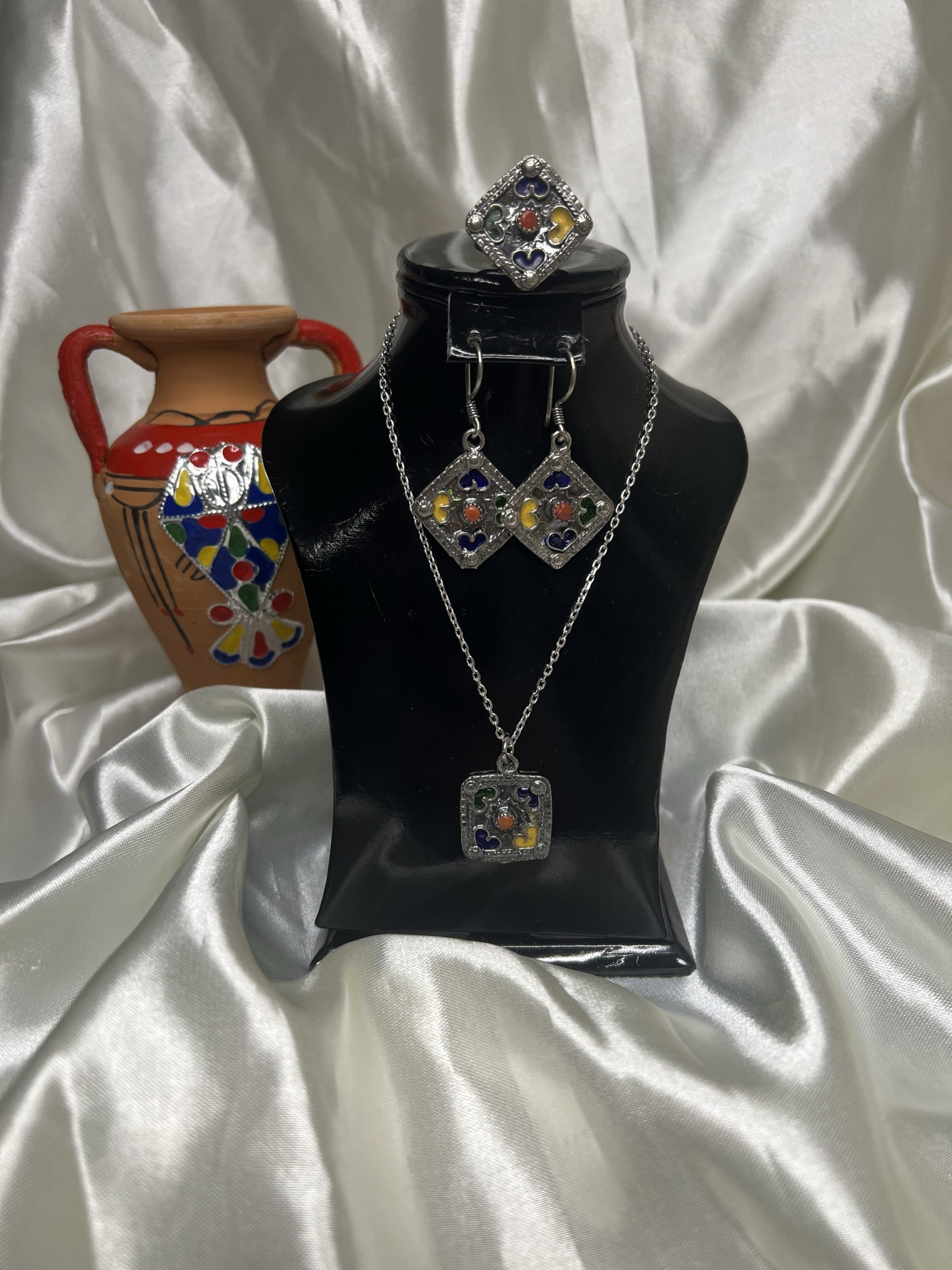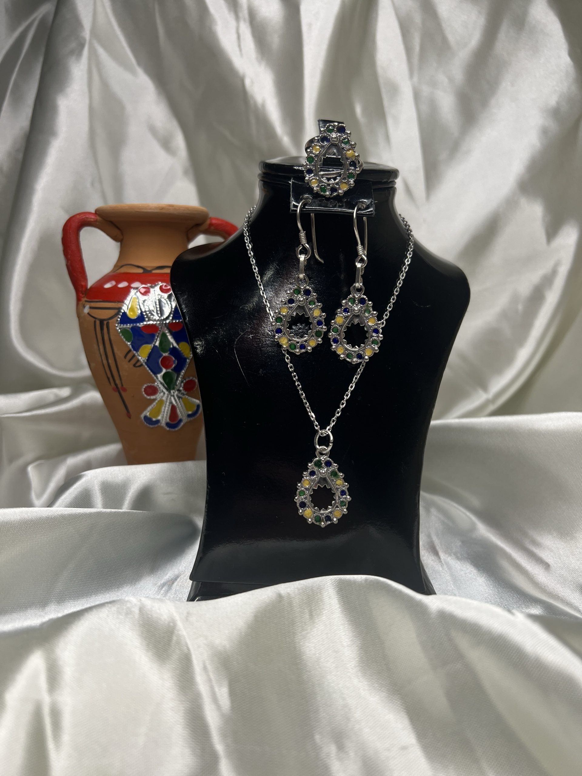 - Trio composé de sa bague taille ajustable, boucles d’oreilles, chaîne et pendentif,