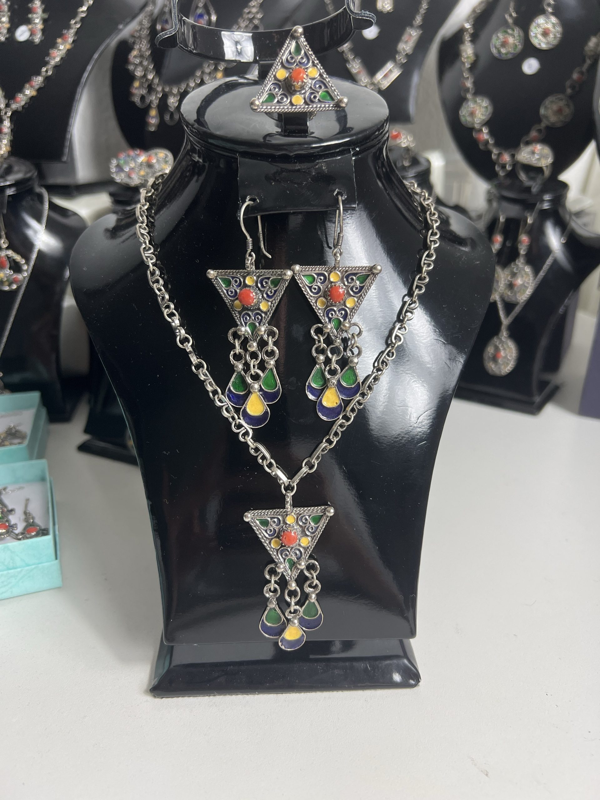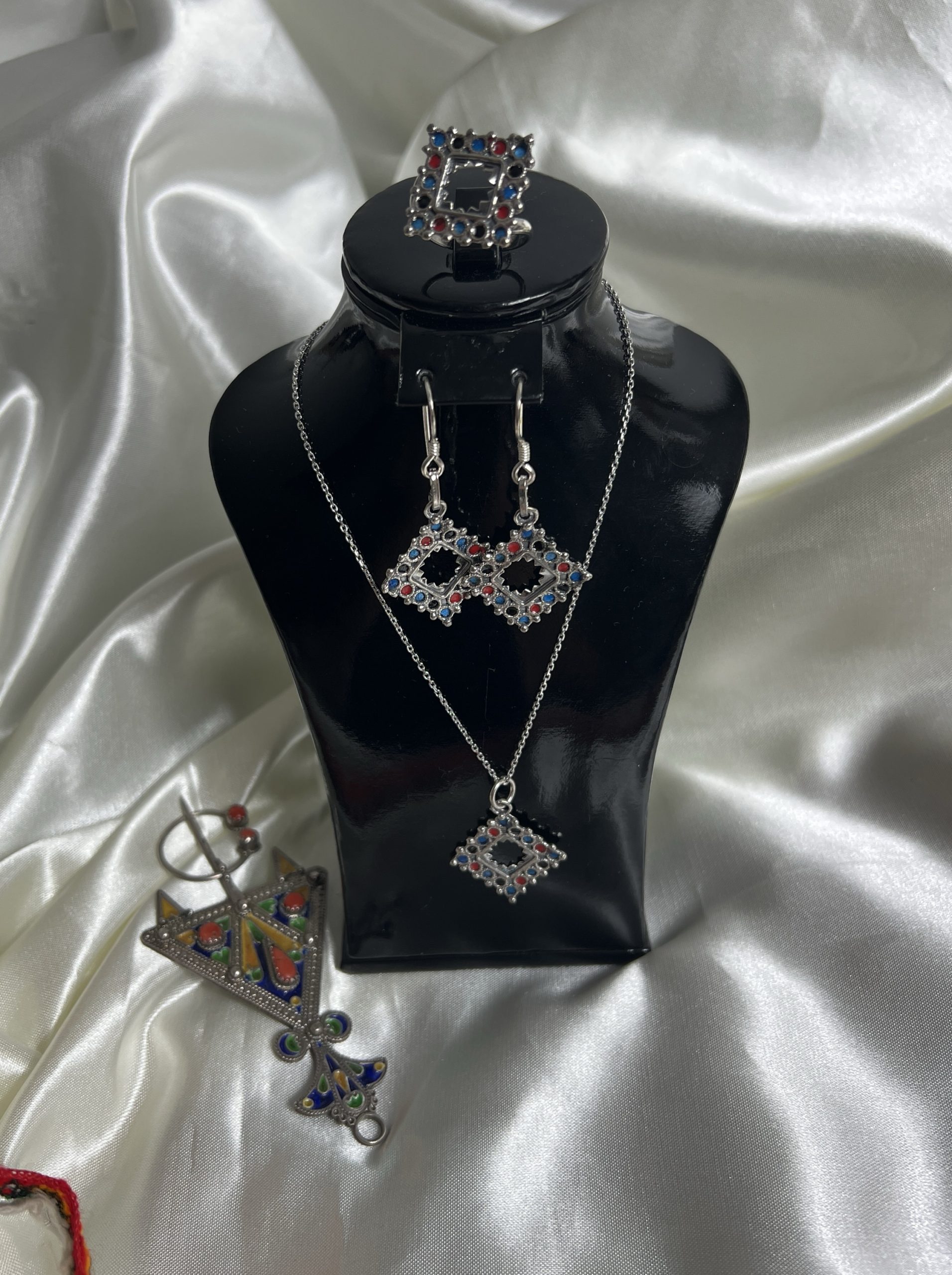 - Trio composé de sa bague taille ajustable, boucles d’oreilles, chaîne et pendentif,